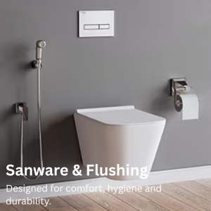 Bathroom accessories – Health Faucet & Jet Spray, Cistern Flush Tank, Toilet Seat Cover, Wash Basin, Wash Basin Faucet, Hand Shower, Overhead Shower, Bathtub, Bathtub Faucet, Bath Diverter Set, Floor Drain, Shower Drain Channel, Basin Coupling, Toilet Paper Holder, Bath Towel Ring, Soap Dish, Tumbler Holder, Basin Bottle Trap, Shelf Tray, Robe Hook